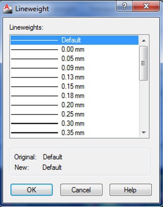 برای تعیین وزن (ضخامت) خط هر لایه، روی این گزینه در نوار لایه کلیک و با حرکت دادن نوار مرور گر مربوطه، ضخامت هر نوع خط برای لایه تعیین میشود. البته باید عبارت Display lineweight در جدول Line weight فعال باشد.