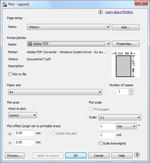 Plot Area: با کلیک در لیست کشوئی این قسمت، چندین گزینه نمایان میشود که مهمترین آنها گزینه Window ی باشد. با انتخاب این گزینه پنجره موقتا بسته میشود و شما این امکان را دارید که مقدار فضایی را که مایلید پرینت گرفته شود را با ترسیم یک پنجره انتخاب کنید. بعد از تعیین فضای پرینت مجددا پنجره باز میشود.